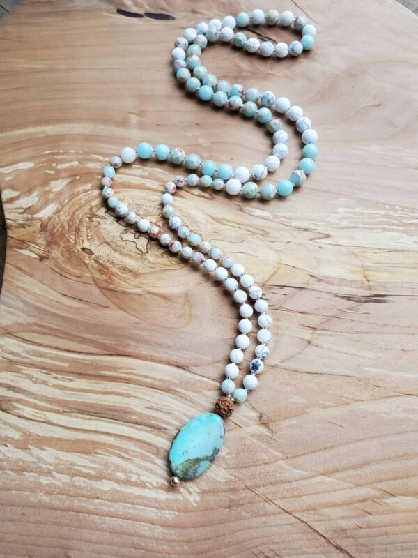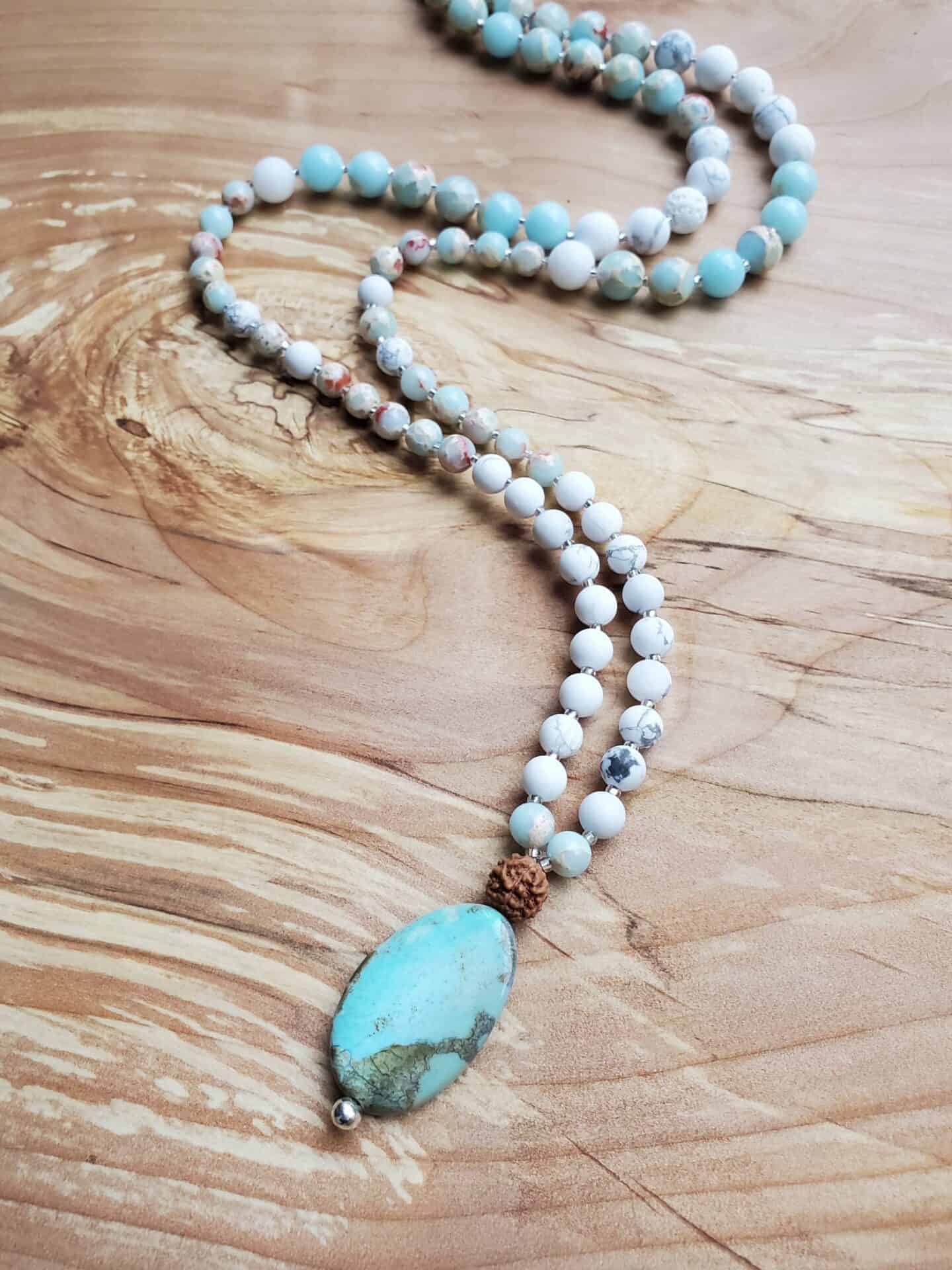 This calming mala features Howlite, Sea Sediment Jasper, Lava Stones, Snow Quartz and Rudraksha Seeds. The Robin’s Egg Agate guru stone ties this Mala necklace together.
